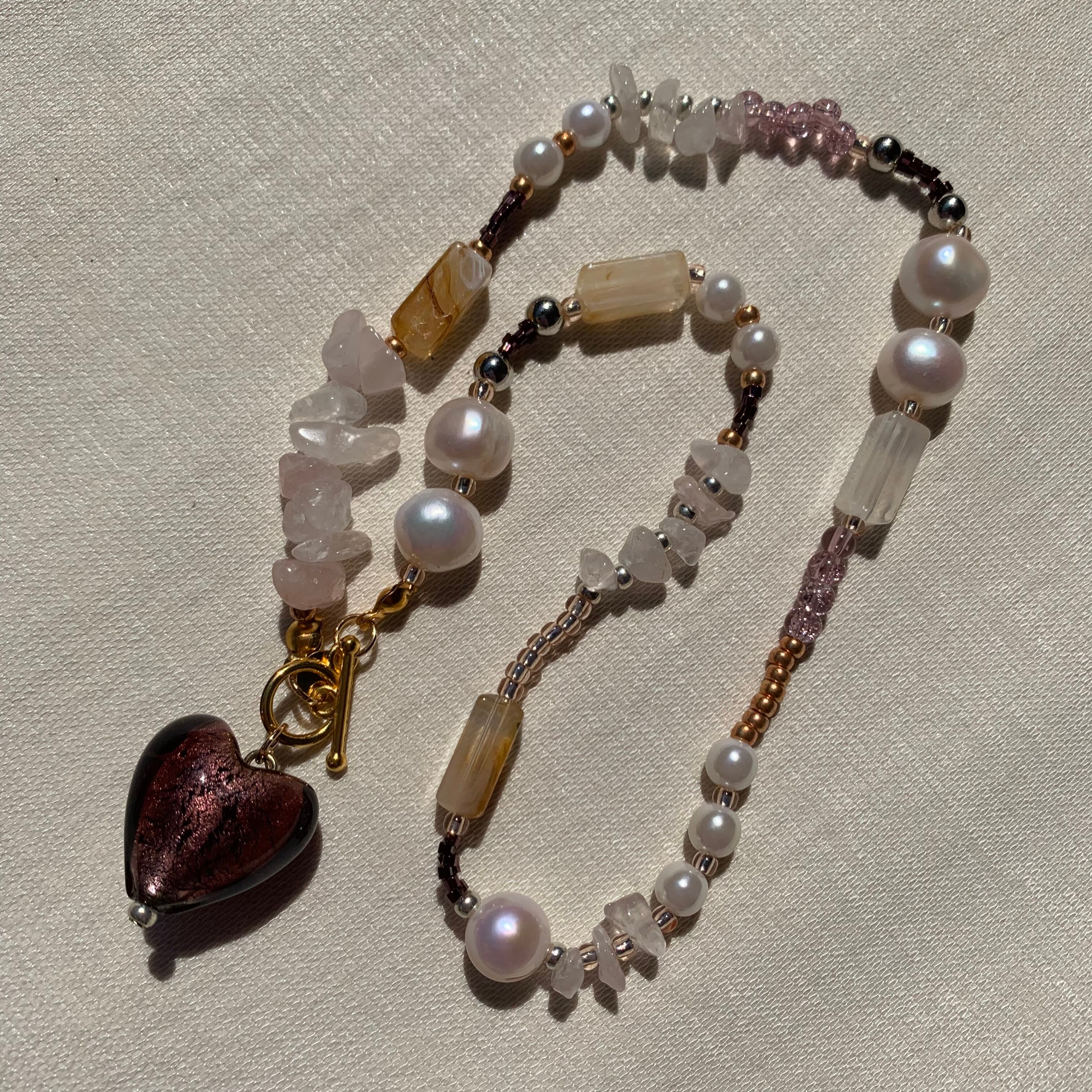 それぞれに淡水パールとパープル系にはローズクォーツのさざれ石、ブラウン系にはシトリンのさざれ石・ダルメシアンジャスパーを合わせました。